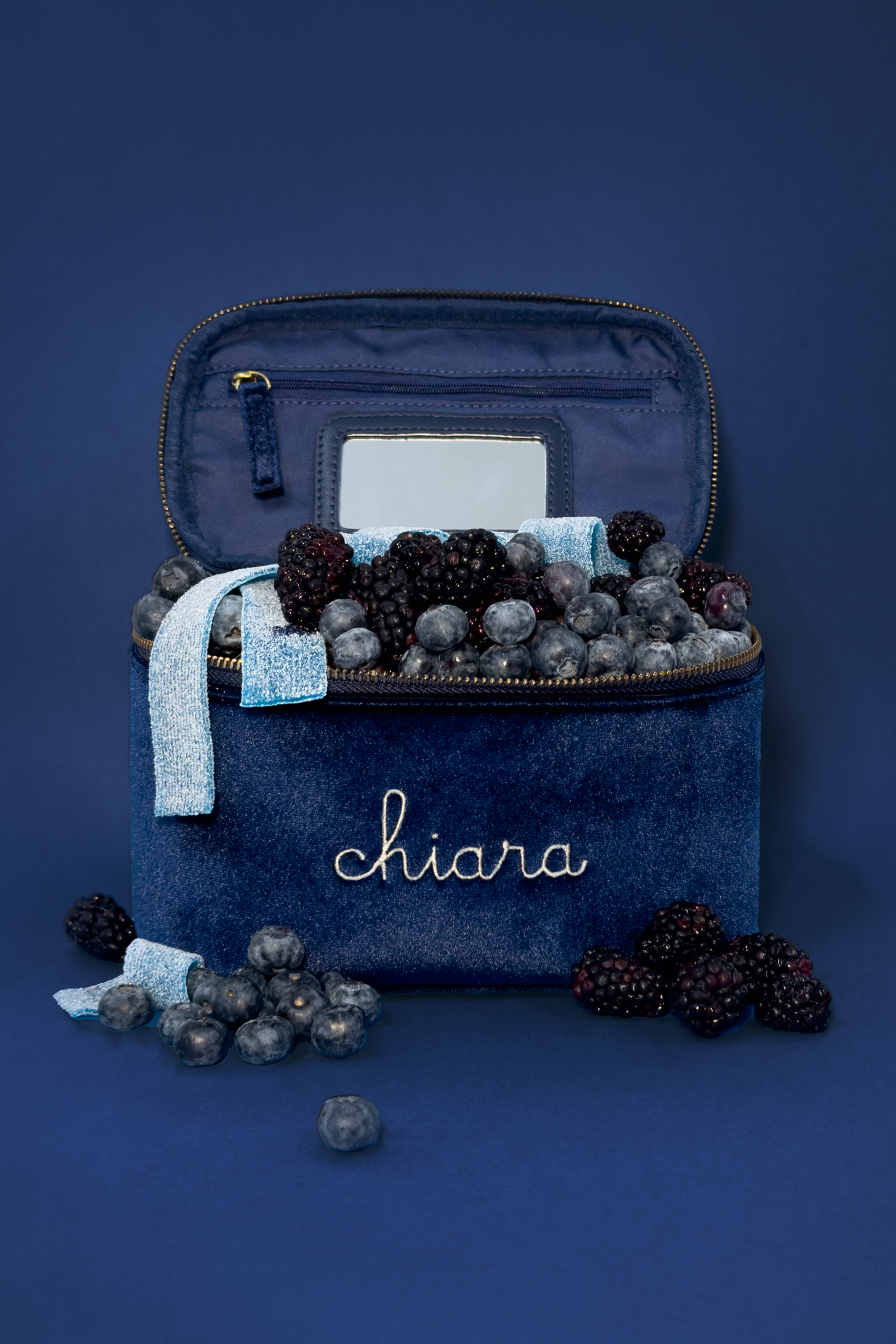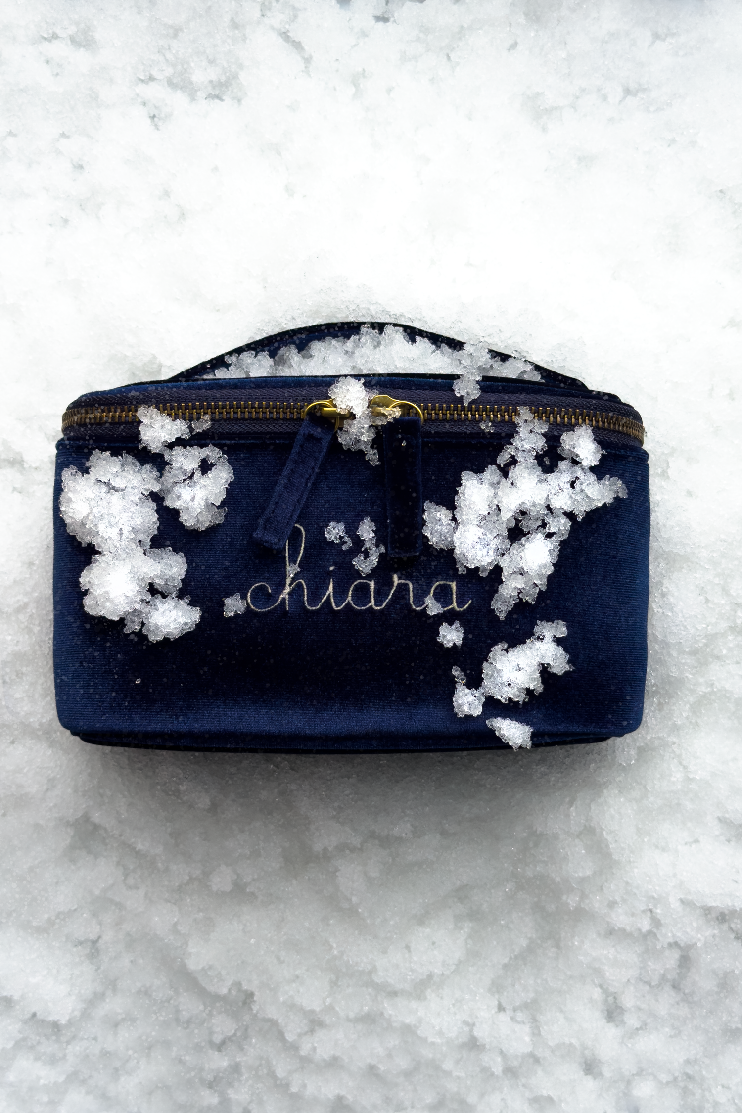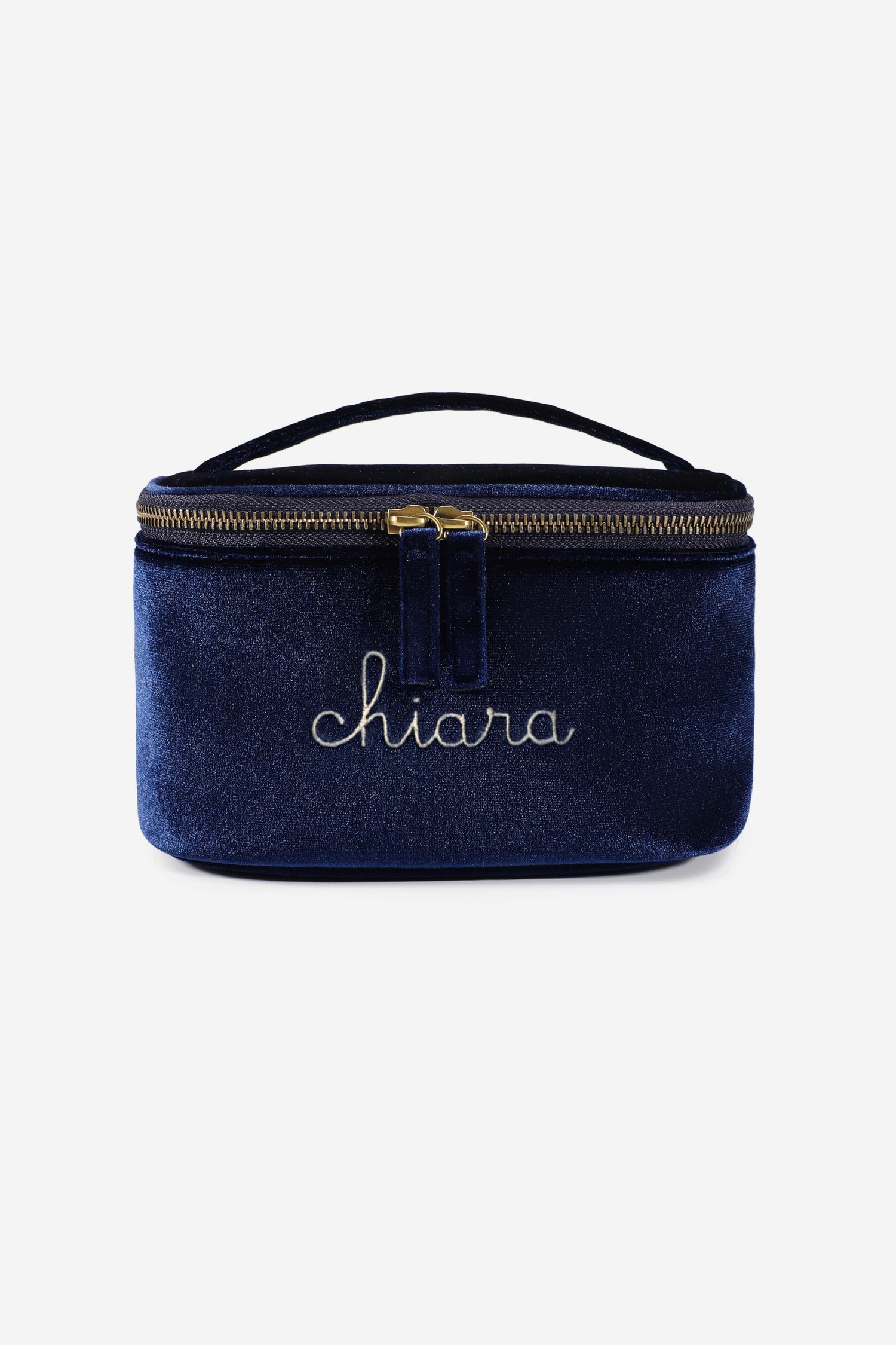 Realizzato in velluto super luminoso, con zip bronzata e il tuo nome ricamato sul fronte.
