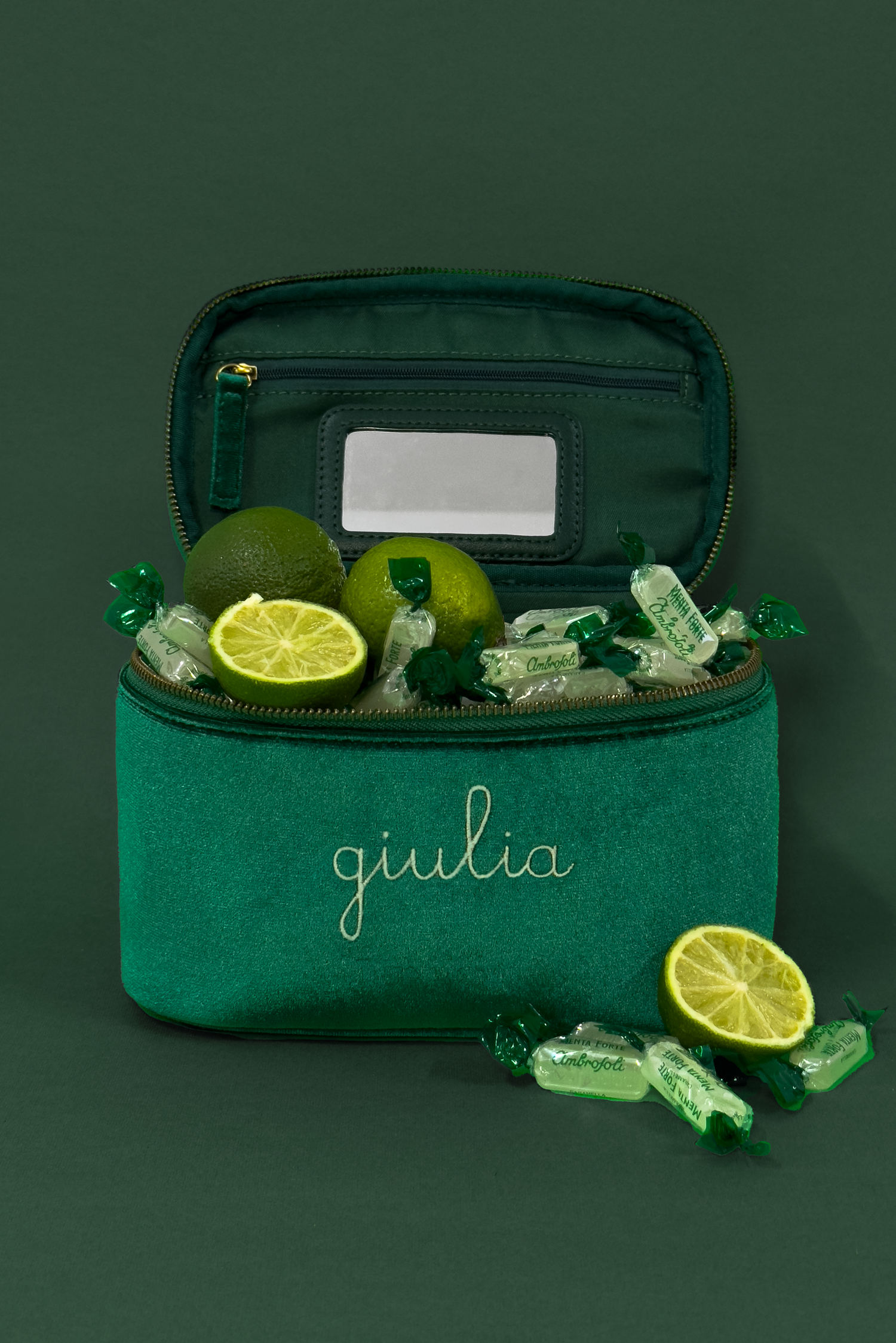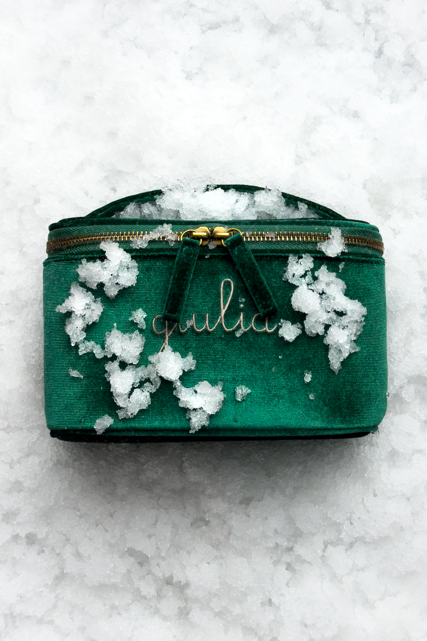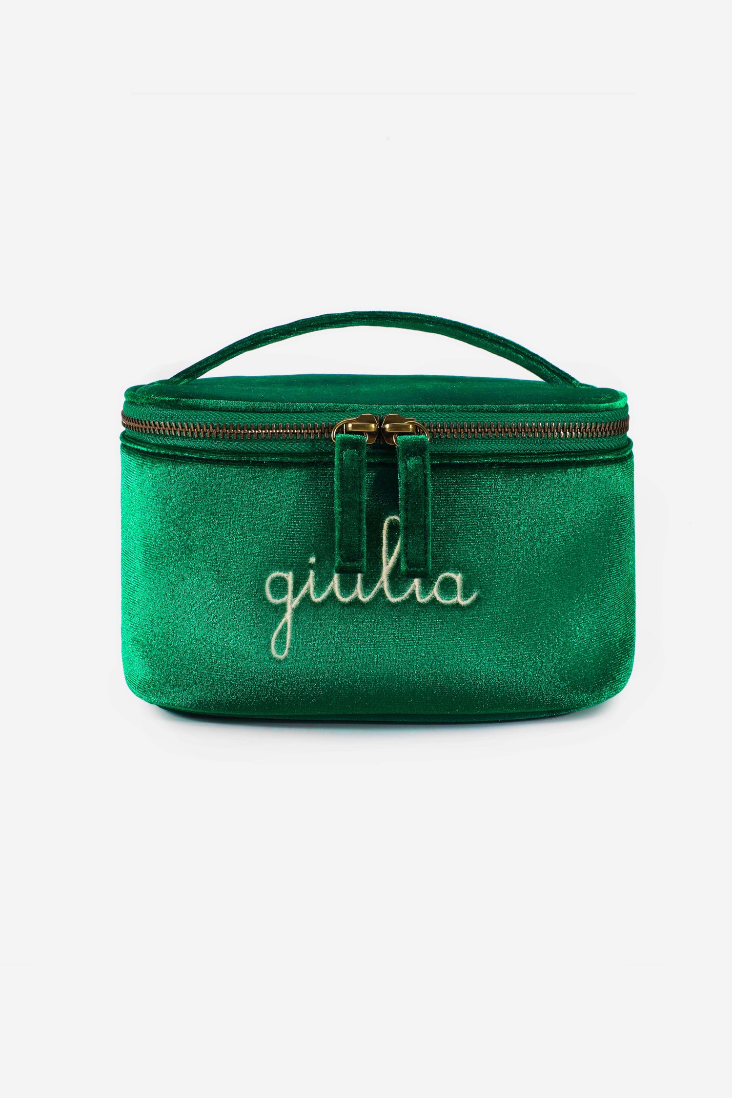 Realizzato in velluto super luminoso, con zip bronzata e il tuo nome ricamato sul fronte.