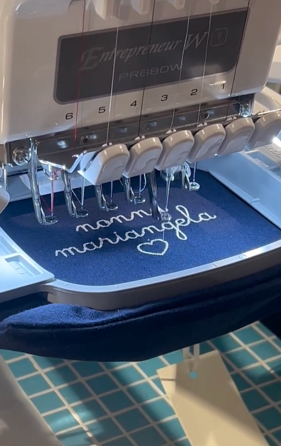 Ogni prodotto viene personalizzato a mano nel nostro laboratorio in Italia, con ricami su misura realizzati con cura uno per uno. Puoi scegliere il nome, le iniziali o una frase speciale: sarà davvero solo tua.