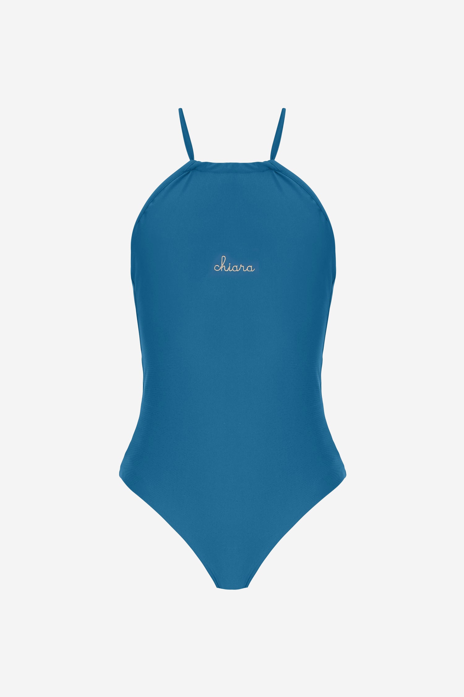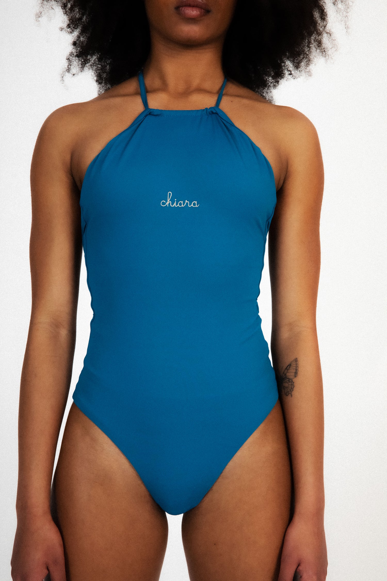 Lo scollo all’americana si chiude con dei laccetti sottili, comodi e regolabili. Sta bene sia su un seno piccolo che più pieno, e la schiena è tutta scoperta, con un taglio morbido che lascia spazio al sole.