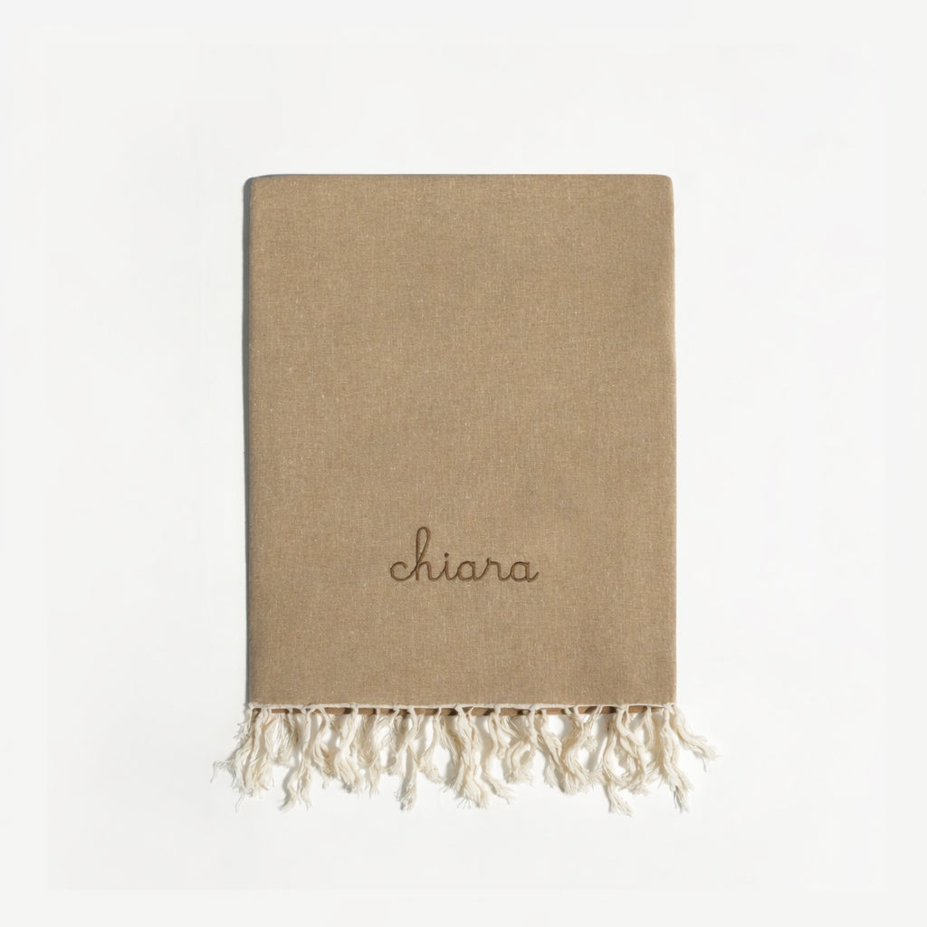 Ogni prodotto viene personalizzato a mano nel nostro laboratorio in Italia, con ricami su misura realizzati con cura uno per uno. Puoi scegliere il nome, le iniziali o una frase speciale: sarà davvero solo tua.